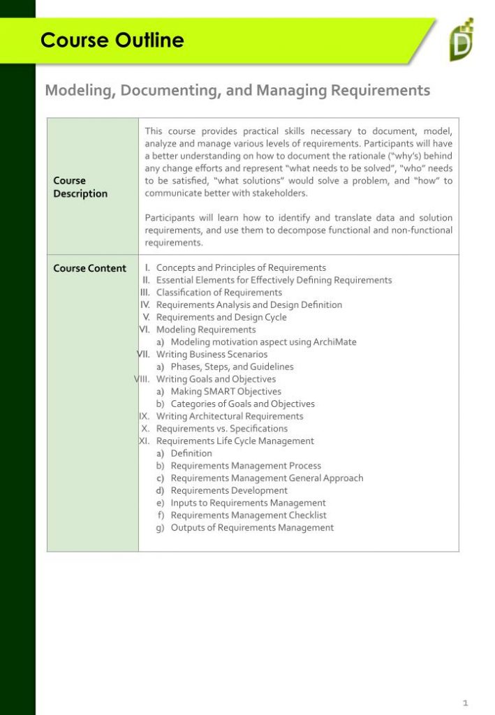 Modeling, Documenting, and Managing Requirements provides practical skills necessary to document, model, analyze and manage various levels of requirements. Participants will have a better understanding on how to document the rationale (“why’s) behind any change efforts and represent “what needs to be solved”, “who” needs to be satisfied, “what solutions” would solve a problem, and “how” to communicate better with stakeholders.